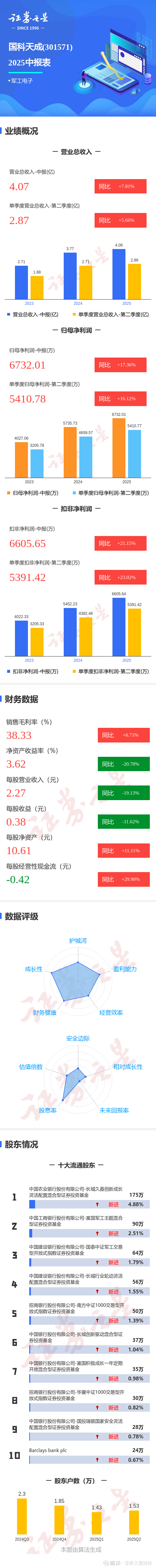 证券之星消息,国科天成2025年中报显示,公司主营收入4.07亿元,同比上升7.81%;归母净利润6732.01万元,同比上升17.37%;扣非净利润6605.65万元,同比上升21.16%;其中2025年第二季度,公司单季度主营收入2.87亿元,同比上升5.66%;单季度归母净利润5410.78万元,同比上升16.12%;单季度扣非净利润5391.42万元,同比上升23.02%;负债率31.27%,投资收益-31.0万元,财务费用683.18万元,毛利率38.33%。