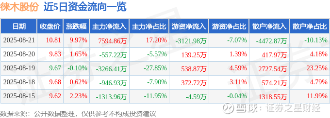 8月21日的资金流向数据方面,主力资金净流入7594.86万元,占总成交额17.2%,游资资金净流出3121.98万元,占总成交额7.07%,散户资金净流出4472.87万元,占总成交额10.13%。