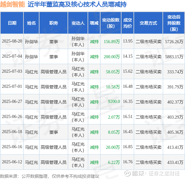 越剑智能近半年内的董监高及核心技术人员增减持详情如下: