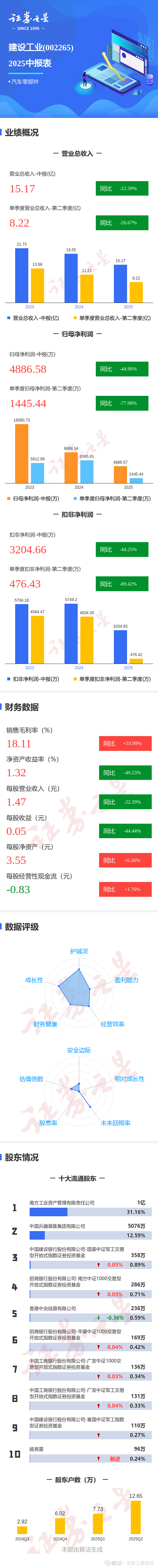 证券之星消息,建设工业2025年中报显示,公司主营收入15.17亿元,同比下降22.4%;归母净利润4886.58万元,同比下降44.9%;扣非净利润3204.66万元,同比下降44.26%;其中2025年第二季度,公司单季度主营收入8.22亿元,同比下降26.67%;单季度归母净利润1445.44万元,同比下降77.99%;单季度扣非净利润476.43万元,同比下降89.42%;负债率54.77%,投资收益2399.17万元,财务费用-856.34万元,毛利率18.11%。