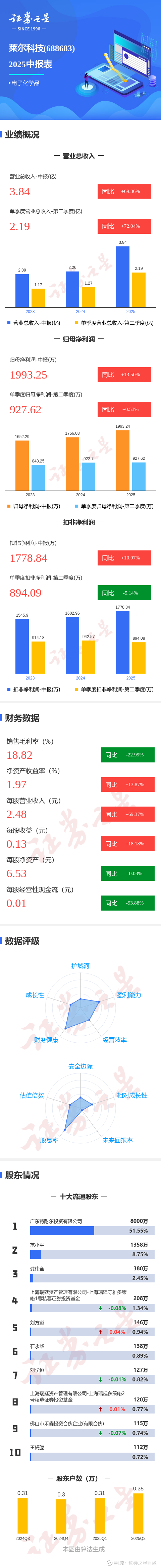 证券之星消息,莱尔科技2025年中报显示,公司主营收入3.84亿元,同比上升69.37%;归母净利润1993.25万元,同比上升13.51%;扣非净利润1778.84万元,同比上升10.97%;其中2025年第二季度,公司单季度主营收入2.19亿元,同比上升72.05%;单季度归母净利润927.62万元,同比上升0.53%;单季度扣非净利润894.09万元,同比下降5.14%;负债率29.42%,投资收益6.18万元,财务费用-37.65万元,毛利率18.82%。