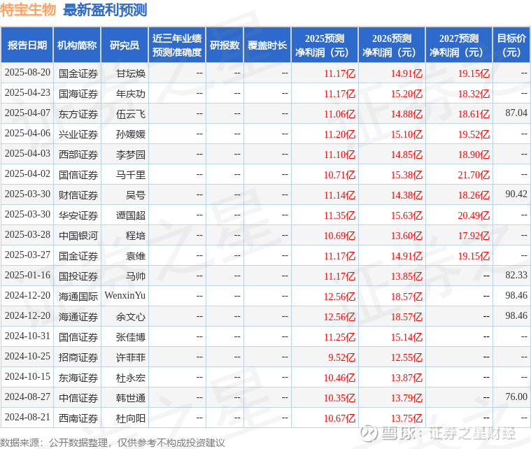 最新盈利预测明细如下: