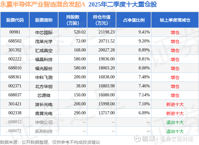 永赢半导体产业智选混合发起A的前十大重仓股如下: