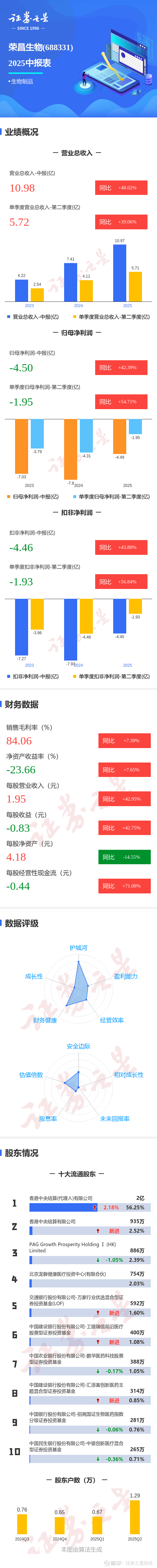 证券之星消息,荣昌生物2025年中报显示,公司主营收入10.98亿元,同比上升48.02%;归母净利润-4.5亿元,同比上升42.4%;扣非净利润-4.46亿元,同比上升43.88%;其中2025年第二季度,公司单季度主营收入5.72亿元,同比上升39.06%;单季度归母净利润-1.95亿元,同比上升54.71%;单季度扣非净利润-1.93亿元,同比上升56.85%;负债率59.7%,投资收益-443.39万元,财务费用4546.43万元,毛利率84.06%。