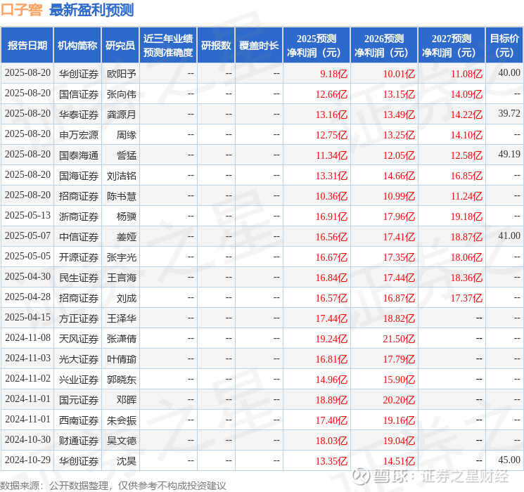 最新盈利预测明细如下:
