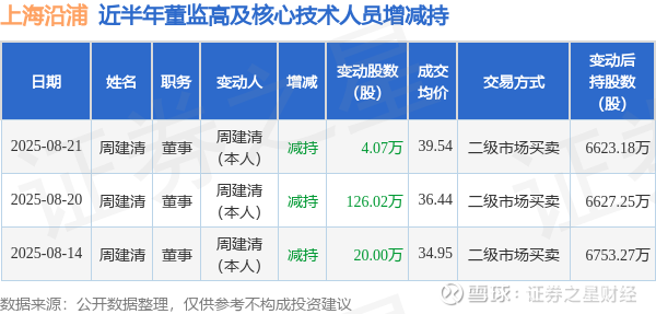 证券之星消息,根据8月22日市场公开信息、上市公司公告及交易所披露数据整理,上海沿浦(605128)最新董监高及相关人员股份变动情况:2025年8月21日公司董事周建清共减持公司股份4.07万股,占公司总股本为0.0193%。变动期间公司股价下跌2.91%,8月21日当日收盘报38.7元。