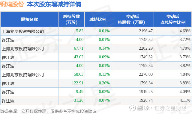 证券之星消息,8月22日锦鸡股份发布公告《锦鸡股份:关于股东减持股份计划到期暨减持股份进展的公告》,其股东上海兆亨投资有限公司、许江波于2025年5月28日至2025年6月13日间合计减持346.84万股,占公司目前总股本的0.7398%,变动期间该股股价上涨60.71%,截止6月13日收盘报11.25元。