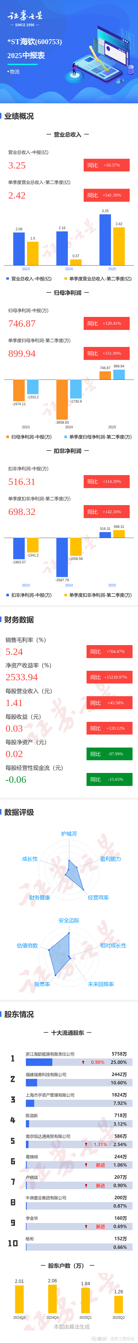 证券之星消息,*ST海钦2025年中报显示,公司主营收入3.25亿元,同比上升50.38%;归母净利润746.87万元,同比上升120.41%;扣非净利润516.31万元,同比上升114.39%;其中2025年第二季度,公司单季度主营收入2.42亿元,同比上升541.4%;单季度归母净利润899.94万元,同比上升151.99%;单季度扣非净利润698.32万元,同比上升142.1%;负债率98.67%,投资收益0.53万元,财务费用97.72万元,毛利率5.24%。
