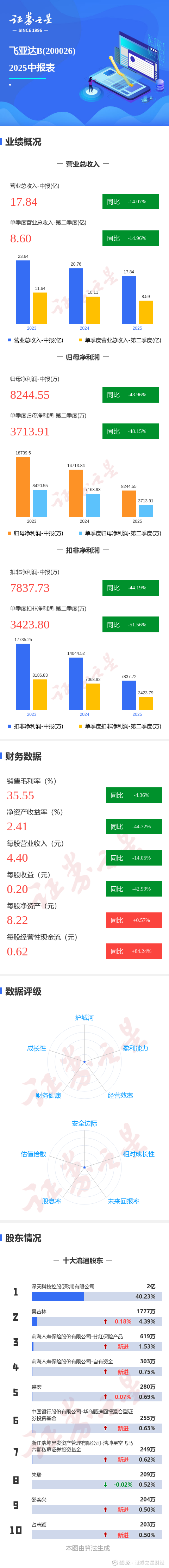 证券之星消息,飞亚达B2025年中报显示,公司主营收入17.84亿元,同比下降14.08%;归母净利润8244.55万元,同比下降43.97%;扣非净利润7837.73万元,同比下降44.19%;其中2025年第二季度,公司单季度主营收入8.6亿元,同比下降14.96%;单季度归母净利润3713.91万元,同比下降48.16%;单季度扣非净利润3423.8万元,同比下降51.57%;负债率14.05%,投资收益74.2万元,财务费用564.01万元,毛利率35.55%。