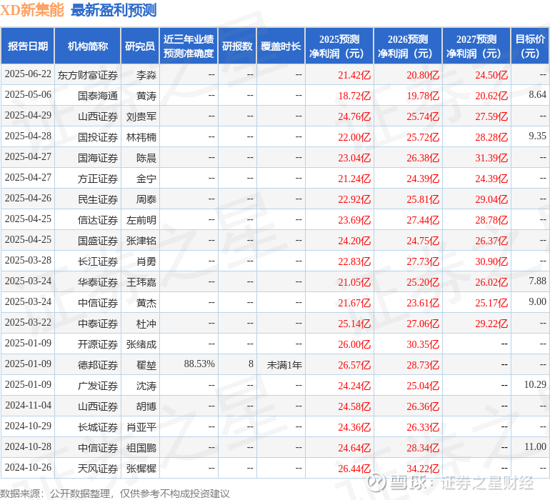 最新盈利预测明细如下:
