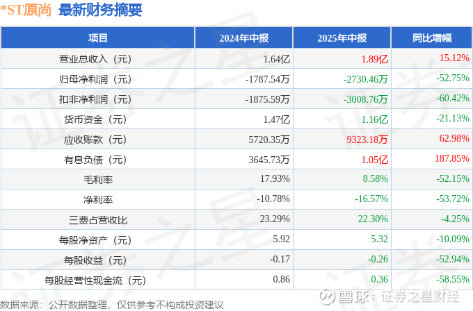 据证券之星公开数据整理,近期*ST原尚(603813)发布2025年中报。根据财报显示,*ST原尚增收不增利。截至本报告期末,公司营业总收入1.89亿元,同比上升15.12%,归母净利润-2730.46万元,同比下降52.75%。按单季度数据看,第二季度营业总收入1.08亿元,同比上升25.44%,第二季度归母净利润-1264.15万元,同比下降41.95%。
