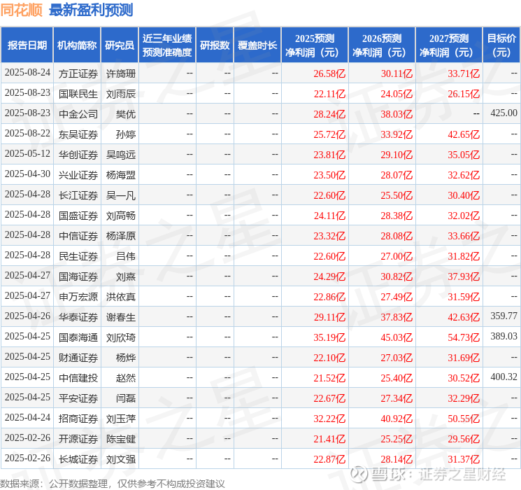 最新盈利预测明细如下: