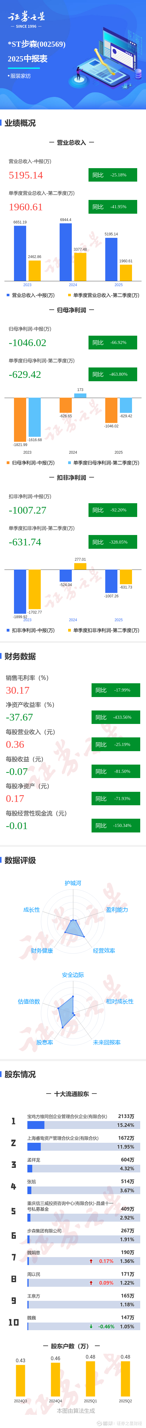 证券之星消息,*ST步森2025年中报显示,公司主营收入5195.14万元,同比下降25.19%;归母净利润-1046.02万元,同比下降66.92%;扣非净利润-1007.27万元,同比下降92.21%;其中2025年第二季度,公司单季度主营收入1960.61万元,同比下降41.95%;单季度归母净利润-629.42万元,同比下降463.81%;单季度扣非净利润-631.74万元,同比下降328.05%;负债率85.89%,投资收益-63.5万元,财务费用40.2万元,毛利率30.17%。