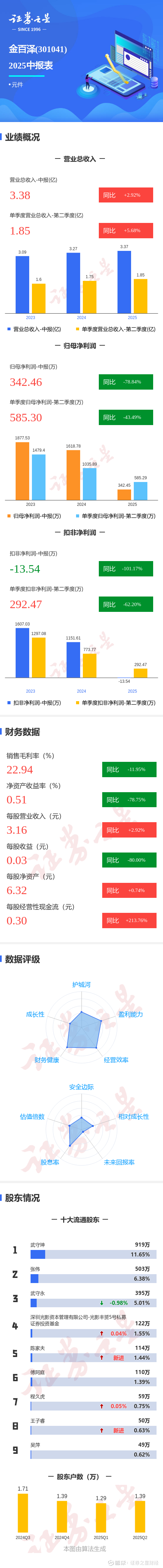 证券之星消息,金百泽2025年中报显示,公司主营收入3.38亿元,同比上升2.93%;归母净利润342.46万元,同比下降78.84%;扣非净利润-13.54万元,同比下降101.18%;其中2025年第二季度,公司单季度主营收入1.85亿元,同比上升5.69%;单季度归母净利润585.3万元,同比下降43.5%;单季度扣非净利润292.47万元,同比下降62.2%;负债率24.0%,投资收益101.08万元,财务费用23.95万元,毛利率22.94%。