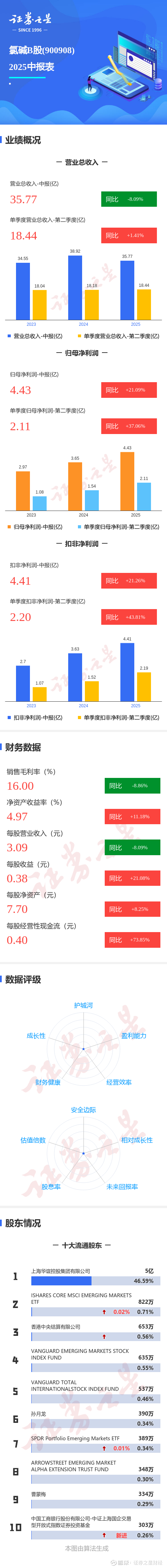 证券之星消息,氯碱B股2025年中报显示,公司主营收入35.77亿元,同比下降8.1%;归母净利润4.43亿元,同比上升21.09%;扣非净利润4.41亿元,同比上升21.26%;其中2025年第二季度,公司单季度主营收入18.44亿元,同比上升1.42%;单季度归母净利润2.11亿元,同比上升37.06%;单季度扣非净利润2.2亿元,同比上升43.82%;负债率30.49%,投资收益1.01亿元,财务费用-3464.65万元,毛利率16.0%。