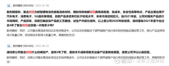 值得一提的是,两年后,该项目仍没有太大进展。有投资者对该项目的进展及量产情况提出质疑。公司方面回应称,复合集流体项目正在有序推进中,公司正在积极配合下游终端客户进行电芯的持续验证测试等工作,部分产品送样形成小批量订单,但目前尚未取得大批量订单。