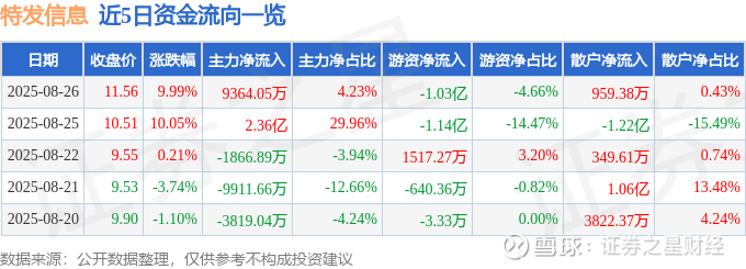 证券之星消息,特发信息8月26日涨停收盘,收盘价11.56元。该股于13点54分涨停,1次打开涨停,截止收盘封单资金为7252.74万元,占其流通市值0.71%。