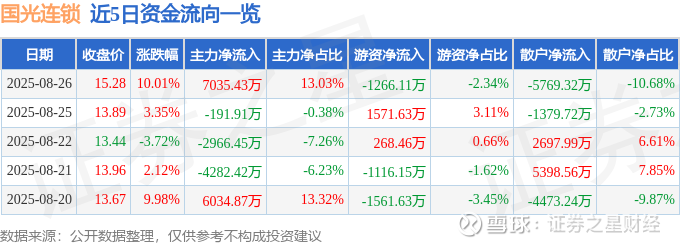 证券之星消息,国光连锁8月26日涨停收盘,收盘价15.28元。该股于14点42分涨停,未打开涨停,截止收盘封单资金为7587.13万元,占其流通市值0.99%。