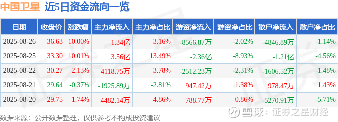 证券之星消息,中国卫星8月26日涨停收盘,收盘价36.63元。该股于9点39分涨停,3次打开涨停,截止收盘封单资金为2.4亿元,占其流通市值0.55%。