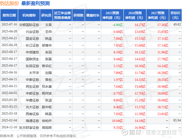 最新盈利预测明细如下: