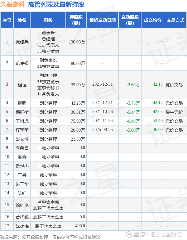 久吾高科近半年内的董监高及核心技术人员增减持详情如下: