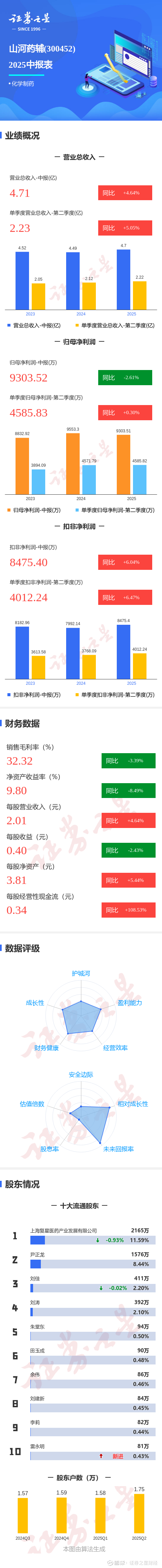 证券之星消息,山河药辅2025年中报显示,公司主营收入4.71亿元,同比上升4.65%;归母净利润9303.52万元,同比下降2.61%;扣非净利润8475.4万元,同比上升6.05%;其中2025年第二季度,公司单季度主营收入2.23亿元,同比上升5.06%;单季度归母净利润4585.83万元,同比上升0.31%;单季度扣非净利润4012.24万元,同比上升6.48%;负债率37.7%,投资收益623.21万元,财务费用504.29万元,毛利率32.32%。