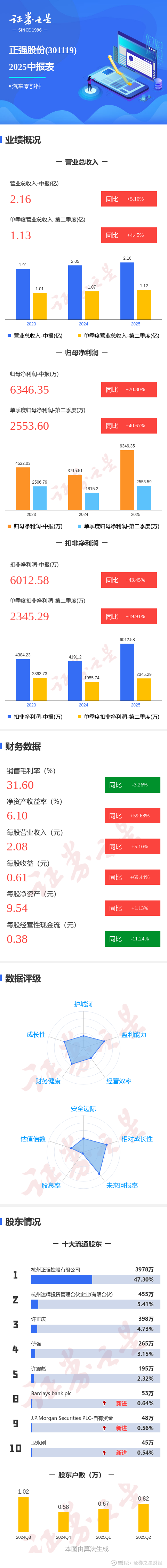 证券之星消息,正强股份2025年中报显示,公司主营收入2.16亿元,同比上升5.11%;归母净利润6346.35万元,同比上升70.81%;扣非净利润6012.58万元,同比上升43.46%;其中2025年第二季度,公司单季度主营收入1.13亿元,同比上升4.46%;单季度归母净利润2553.6万元,同比上升40.68%;单季度扣非净利润2345.29万元,同比上升19.92%;负债率33.83%,投资收益72.58万元,财务费用-2481.54万元,毛利率31.6%。