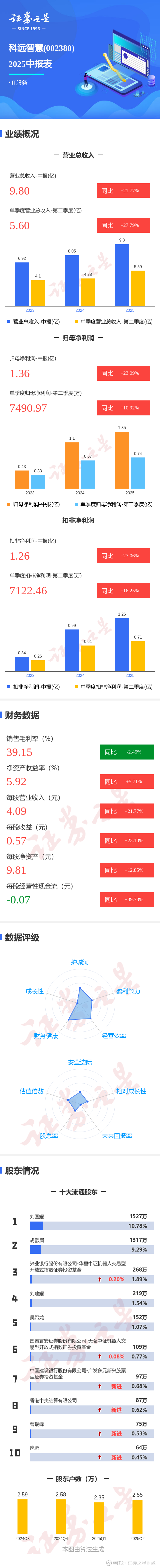 证券之星消息,科远智慧2025年中报显示,公司主营收入9.8亿元,同比上升21.78%;归母净利润1.36亿元,同比上升23.09%;扣非净利润1.26亿元,同比上升27.06%;其中2025年第二季度,公司单季度主营收入5.6亿元,同比上升27.79%;单季度归母净利润7490.97万元,同比上升10.92%;单季度扣非净利润7122.46万元,同比上升16.25%;负债率37.3%,投资收益385.8万元,财务费用34.41万元,毛利率39.15%。
