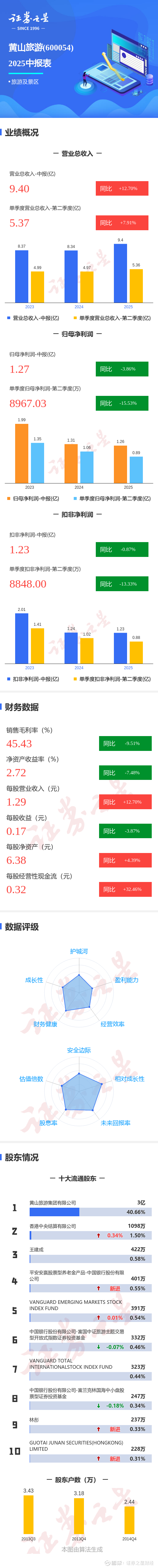 证券之星消息,黄山旅游2025年中报显示,公司主营收入9.4亿元,同比上升12.7%;归母净利润1.27亿元,同比下降3.87%;扣非净利润1.23亿元,同比下降0.88%;其中2025年第二季度,公司单季度主营收入5.37亿元,同比上升7.91%;单季度归母净利润8967.03万元,同比下降15.53%;单季度扣非净利润8848.0万元,同比下降13.34%;负债率15.3%,投资收益-403.57万元,财务费用206.43万元,毛利率45.43%。