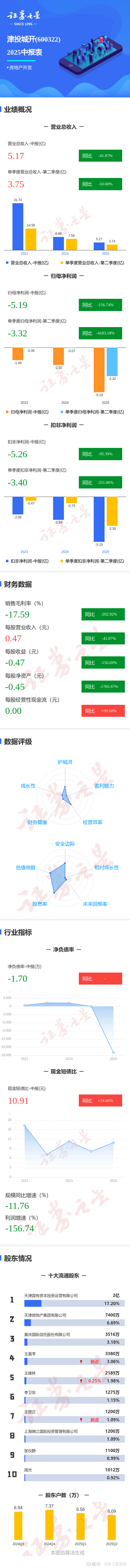 证券之星消息,津投城开2025年中报显示,公司主营收入5.17亿元,同比下降41.87%;归母净利润-5.19亿元,同比下降156.74%;扣非净利润-5.26亿元,同比下降95.4%;其中2025年第二季度,公司单季度主营收入3.75亿元,同比下降50.6%;单季度归母净利润-3.32亿元,同比下降4183.19%;单季度扣非净利润-3.4亿元,同比下降351.06%;负债率100.36%,投资收益-554.88万元,财务费用2.72亿元,毛利率-17.59%。