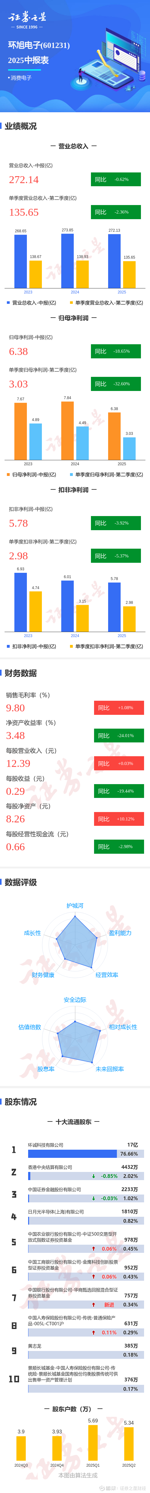 证券之星消息,环旭电子2025年中报显示,公司主营收入272.14亿元,同比下降0.63%;归母净利润6.38亿元,同比下降18.66%;扣非净利润5.78亿元,同比下降3.93%;其中2025年第二季度,公司单季度主营收入135.65亿元,同比下降2.37%;单季度归母净利润3.03亿元,同比下降32.61%;单季度扣非净利润2.98亿元,同比下降5.38%;负债率53.23%,投资收益2.13亿元,财务费用2.35亿元,毛利率9.8%。