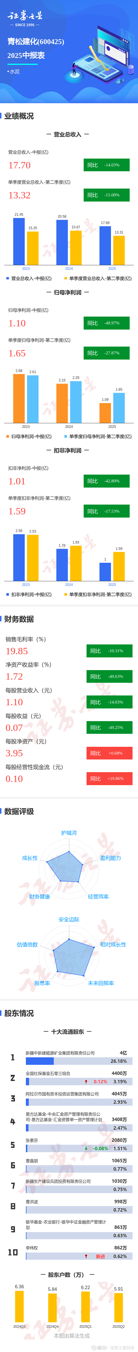 证券之星消息,青松建化2025年中报显示,公司主营收入17.7亿元,同比下降14.03%;归母净利润1.1亿元,同比下降48.98%;扣非净利润1.01亿元,同比下降42.8%;其中2025年第二季度,公司单季度主营收入13.32亿元,同比下降15.0%;单季度归母净利润1.65亿元,同比下降27.87%;单季度扣非净利润1.59亿元,同比下降17.54%;负债率29.92%,投资收益380.26万元,财务费用1883.66万元,毛利率19.85%。