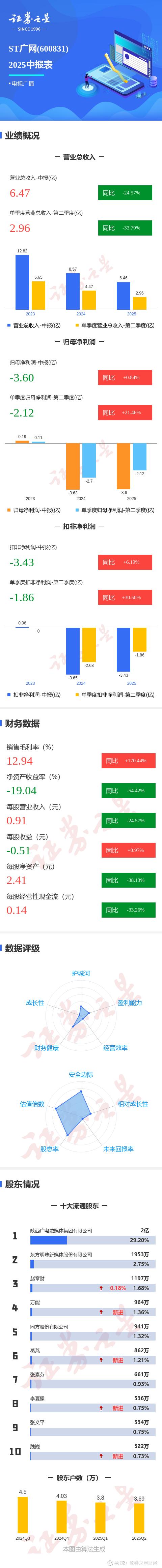 证券之星消息,ST广网2025年中报显示,公司主营收入6.47亿元,同比下降24.58%;归母净利润-3.6亿元,同比上升0.85%;扣非净利润-3.43亿元,同比上升6.2%;其中2025年第二季度,公司单季度主营收入2.96亿元,同比下降33.79%;单季度归母净利润-2.12亿元,同比上升21.47%;单季度扣非净利润-1.86亿元,同比上升30.51%;负债率83.83%,投资收益319.99万元,财务费用1.24亿元,毛利率12.94%。
