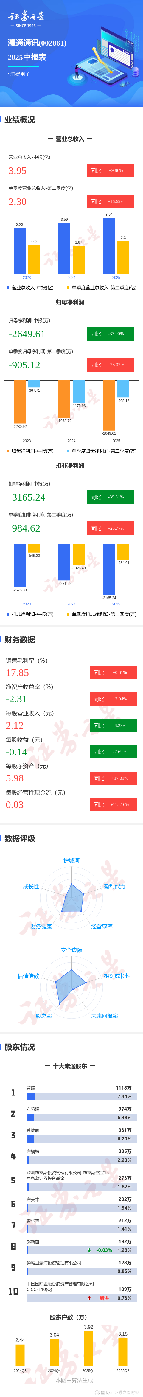 证券之星消息,瀛通通讯2025年中报显示,公司主营收入3.95亿元,同比上升9.81%;归母净利润-2649.61万元,同比下降33.91%;扣非净利润-3165.24万元,同比下降39.32%;其中2025年第二季度,公司单季度主营收入2.3亿元,同比上升16.7%;单季度归母净利润-905.12万元,同比上升23.03%;单季度扣非净利润-984.62万元,同比上升25.77%;负债率31.23%,投资收益51.02万元,财务费用126.24万元,毛利率17.85%。
