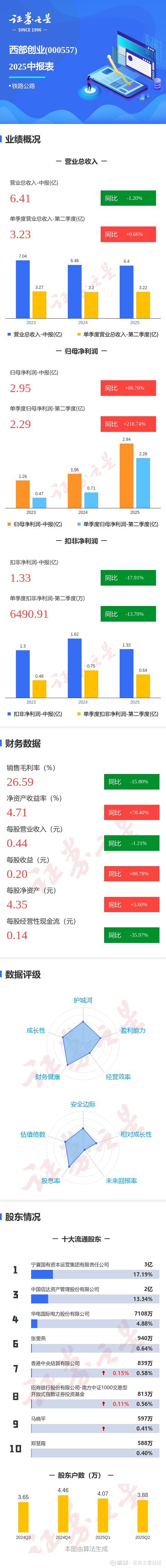 证券之星消息,西部创业2025年中报显示,公司主营收入6.41亿元,同比下降1.2%;归母净利润2.95亿元,同比上升88.7%;扣非净利润1.33亿元,同比下降17.92%;其中2025年第二季度,公司单季度主营收入3.23亿元,同比上升0.67%;单季度归母净利润2.29亿元,同比上升218.75%;单季度扣非净利润6490.91万元,同比下降13.7%;负债率8.84%,投资收益1.65亿元,财务费用-2193.86万元,毛利率26.59%。