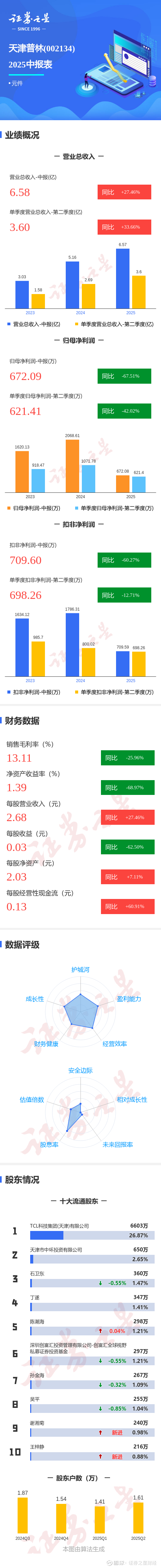 证券之星消息,天津普林2025年中报显示,公司主营收入6.58亿元,同比上升27.47%;归母净利润672.09万元,同比下降67.51%;扣非净利润709.6万元,同比下降60.28%;其中2025年第二季度,公司单季度主营收入3.6亿元,同比上升33.67%;单季度归母净利润621.41万元,同比下降42.02%;单季度扣非净利润698.26万元,同比下降12.72%;负债率62.53%,投资收益121.15万元,财务费用505.71万元,毛利率13.11%。