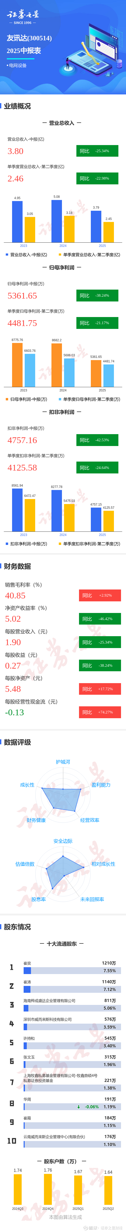 证券之星消息,友讯达2025年中报显示,公司主营收入3.8亿元,同比下降25.34%;归母净利润5361.65万元,同比下降38.25%;扣非净利润4757.16万元,同比下降42.53%;其中2025年第二季度,公司单季度主营收入2.46亿元,同比下降22.99%;单季度归母净利润4481.75万元,同比下降21.18%;单季度扣非净利润4125.58万元,同比下降24.65%;负债率28.28%,投资收益502.69万元,财务费用-379.83万元,毛利率40.85%。