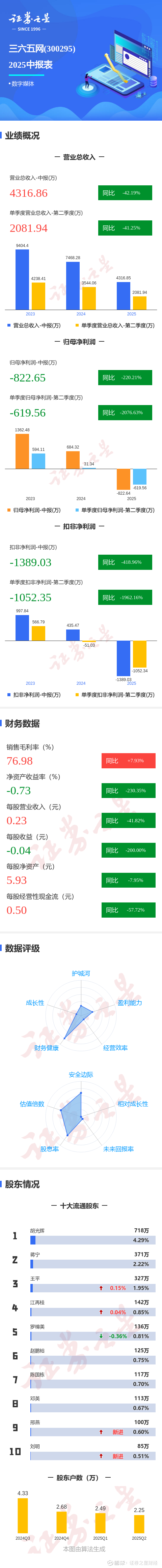 证券之星消息,三六五网2025年中报显示,公司主营收入4316.86万元,同比下降42.2%;归母净利润-822.65万元,同比下降220.21%;扣非净利润-1389.03万元,同比下降418.97%;其中2025年第二季度,公司单季度主营收入2081.94万元,同比下降41.26%;单季度归母净利润-619.56万元,同比下降2076.64%;单季度扣非净利润-1052.35万元,同比下降1962.17%;负债率5.39%,投资收益260.51万元,财务费用-87.17万元,毛利率76.98%。