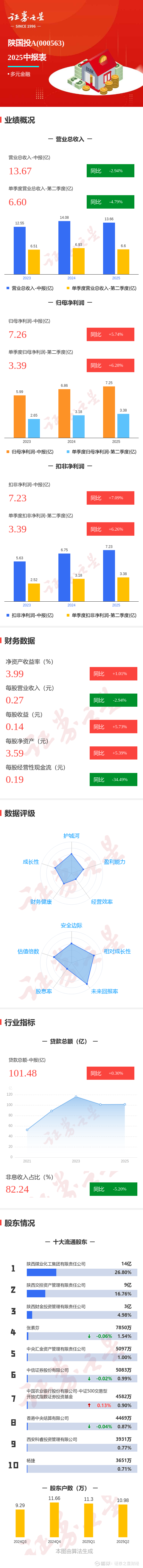 证券之星消息,陕国投A2025年中报显示,公司主营收入13.67亿元,同比下降2.95%;归母净利润7.26亿元,同比上升5.74%;扣非净利润7.23亿元,同比上升7.1%;其中2025年第二季度,公司单季度主营收入6.6亿元,同比下降4.79%;单季度归母净利润3.39亿元,同比上升6.29%;单季度扣非净利润3.39亿元,同比上升6.26%;负债率31.49%,投资收益3.09亿元。