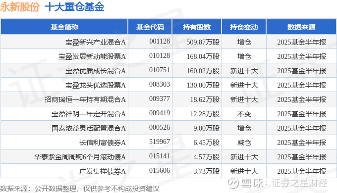 持有永新股份最多的基金为宝盈新兴产业混合A,目前规模为5.78亿元,最新净值1.0997(8月26日),较上一交易日上涨1.4%,近一年上涨58.39%。该基金现任基金经理为王灏。