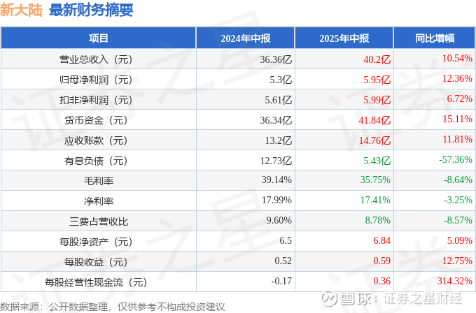 据证券之星公开数据整理,近期新大陆(000997)发布2025年中报。截至本报告期末,公司营业总收入40.2亿元,同比上升10.54%,归母净利润5.95亿元,同比上升12.36%。按单季度数据看,第二季度营业总收入21.23亿元,同比上升12.03%,第二季度归母净利润2.84亿元,同比上升1.06%。本报告期新大陆公司应收账款体量较大,当期应收账款占最新年报归母净利润比达146.25%。
