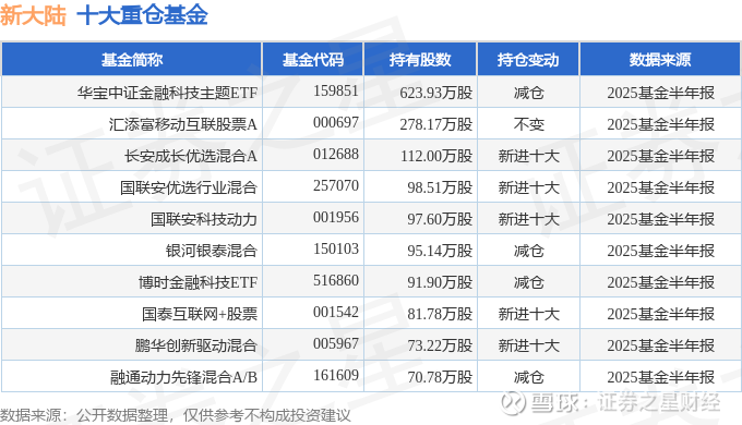 持有新大陆最多的基金为华宝中证金融科技主题ETF,目前规模为57.31亿元,最新净值1.0156(8月26日),较上一交易日下跌0.12%,近一年上涨180.69%。该基金现任基金经理为陈建华 曹旭辰。