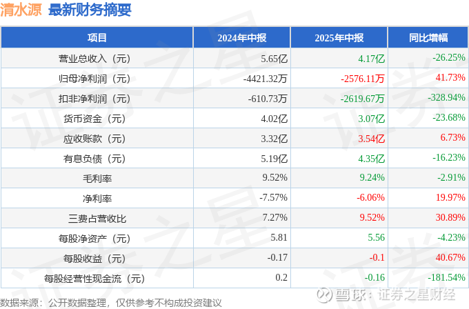 据证券之星公开数据整理,近期清水源(300437)发布2025年中报。根据财报显示,清水源亏损收窄。截至本报告期末,公司营业总收入4.17亿元,同比下降26.25%,归母净利润-2576.11万元,同比上升41.73%。按单季度数据看,第二季度营业总收入2.12亿元,同比下降23.98%,第二季度归母净利润-2058.72万元,同比上升56.76%。