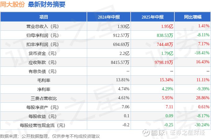 据证券之星公开数据整理,近期同大股份(300321)发布2025年中报。截至本报告期末,公司营业总收入1.95亿元,同比上升1.41%,归母净利润838.53万元,同比下降8.11%。按单季度数据看,第二季度营业总收入1.02亿元,同比下降4.83%,第二季度归母净利润549.22万元,同比下降29.18%。本报告期同大股份公司应收账款体量较大,当期应收账款占最新年报归母净利润比达1166.44%。
