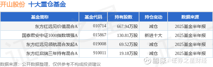 建议关注公司现金流状况(货币资金/流动负债仅为54.53%、近3年经营性现金流均值/流动负债仅为10.34%)建议关注公司债务状况(有息资产负债率已达48.82%、有息负债总额/近3年经营性现金流均值已达13.06%、流动比率仅为0.88)建议关注公司应收账款状况(应收账款/利润已达278.38%)持有开山股份最多的基金为东方红远见价值混合A,目前规模为12.89亿元,最新净值1.1606(8月26日),较上一交易日上涨0.53%,近一年上涨50.77%。该基金现任基金经理为周杨。