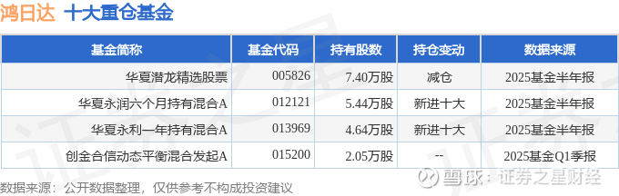 建议关注公司现金流状况(货币资金/流动负债仅为64.46%、近3年经营性现金流均值/流动负债仅为7.16%)建议关注公司债务状况(有息资产负债率已达30.81%、有息负债总额/近3年经营性现金流均值已达12.76%)建议关注公司应收账款状况(年报归母净利润为负)持有鸿日达最多的基金为华夏潜龙精选股票,目前规模为0.89亿元,最新净值2.1514(8月26日),较上一交易日上涨0.63%,近一年上涨26.77%。该基金现任基金经理为徐恒。