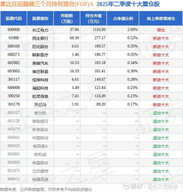 富达任远稳健三个月持有混合(FOF)A的前十大重仓股如下: