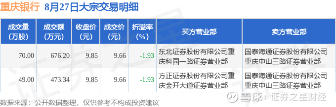 证券之星消息,8月27日重庆银行发生大宗交易,交易数据如下: