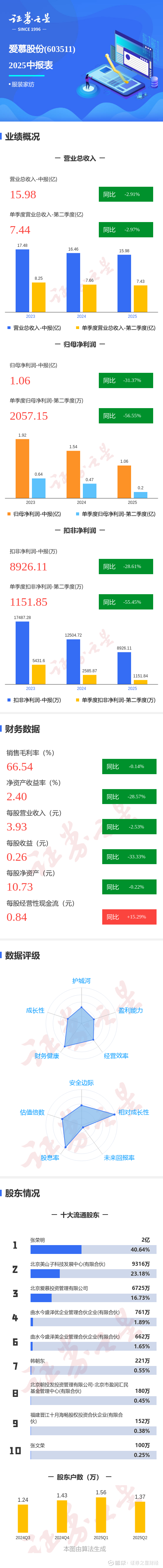 证券之星消息,爱慕股份2025年中报显示,公司主营收入15.98亿元,同比下降2.91%;归母净利润1.06亿元,同比下降31.37%;扣非净利润8926.11万元,同比下降28.62%;其中2025年第二季度,公司单季度主营收入7.44亿元,同比下降2.98%;单季度归母净利润2057.15万元,同比下降56.55%;单季度扣非净利润1151.85万元,同比下降55.46%;负债率13.51%,投资收益1972.09万元,财务费用964.02万元,毛利率66.54%。