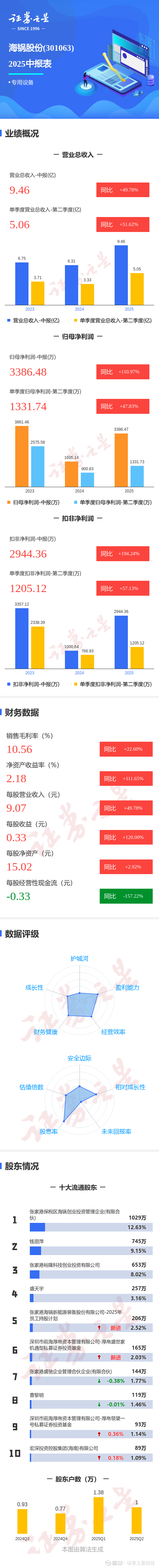 证券之星消息,海锅股份2025年中报显示,公司主营收入9.46亿元,同比上升49.78%;归母净利润3386.48万元,同比上升110.98%;扣非净利润2944.36万元,同比上升194.25%;其中2025年第二季度,公司单季度主营收入5.06亿元,同比上升51.63%;单季度归母净利润1331.74万元,同比上升47.83%;单季度扣非净利润1205.12万元,同比上升57.13%;负债率40.94%,投资收益-26.54万元,财务费用-618.29万元,毛利率10.56%。